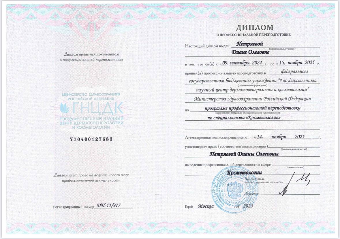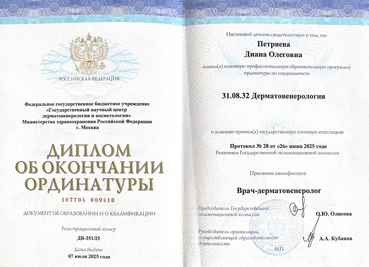 Специальность - «Дерматовенерология».ФГБУ "ГНЦДК" МИНЗДРАВА РОССИИ, профессиональная переподготовка.