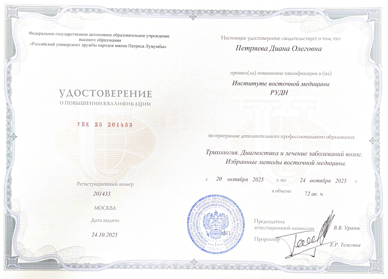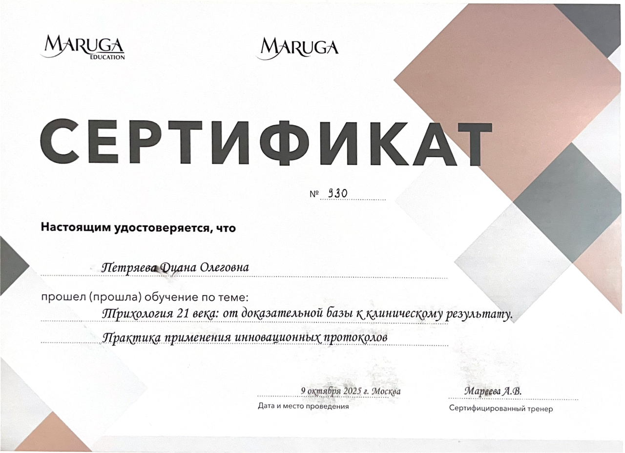 Диана Олеговна сертифицированный специалист и имеет опыт работы в эстетической медицине и трихологии. Постоянно повышает свою квалификацию на сертификационных курсах, в том числе прошла курс медицинской трихологии для врачей Ткачева Владислава Петровича.