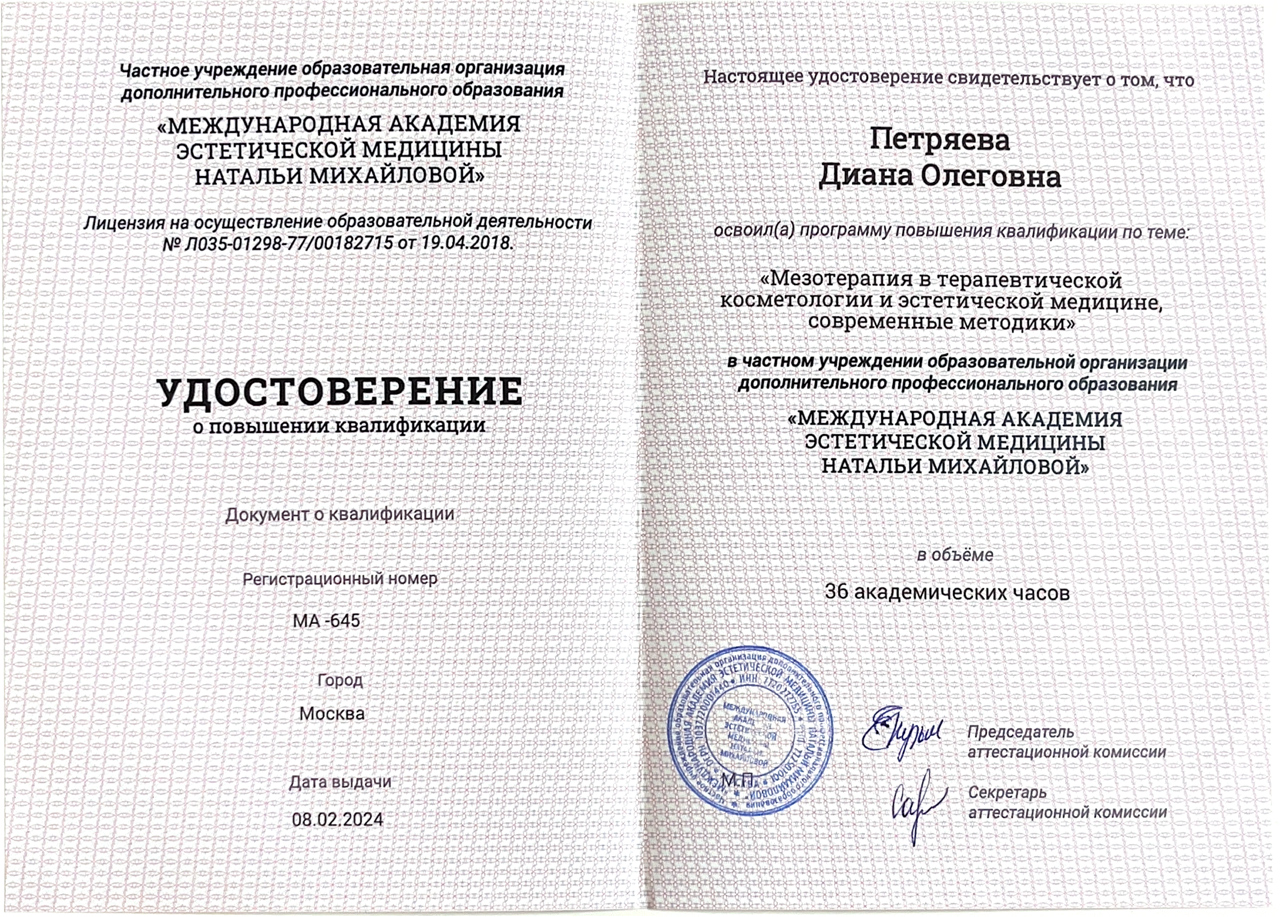 Избранные методы восточной медицины».ЧУ ООДПО "МЕЖДУНАРОДНАЯ АКАДЕМИЯ ЭСТЕТИЧЕСКОЙ МЕДИЦИНЫ НАТАЛЬИ МИХАЙЛОВОЙ", повышение квалификации.